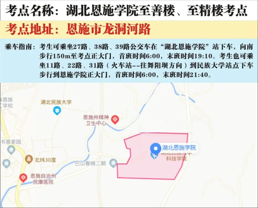 1.乘车指南:考生可乘坐2A路(舞阳坝购物广场--李家槽上路口方向)、2B路(清江种业--硒都广场方向)、8路、11路、22路、31路公交车在“湖北民族大学”站下车,从正门进入校园。考生也可乘坐27路、38路、39路公交车在“民大东门”站下车,从东门(金龙大道方向)进入校园。首班时间5:40,末班时间21:40。