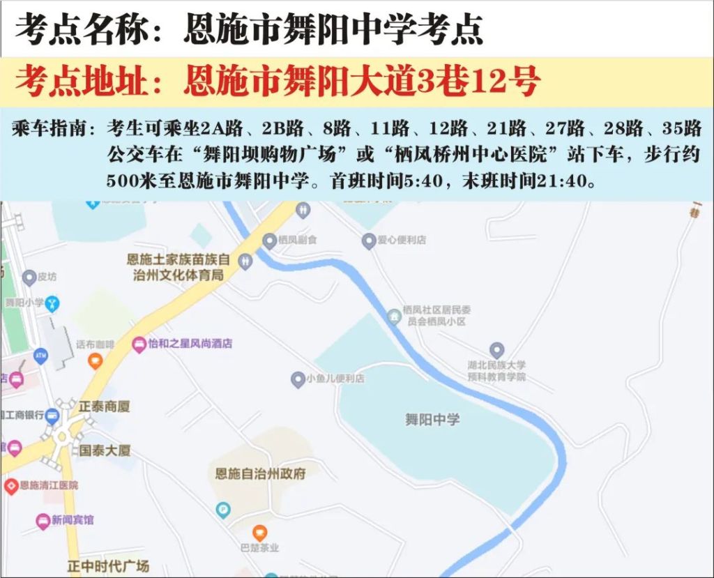 1.乘车指南:考生可乘坐2A路、2B路、8路、11路、12路、21路、27路、28路、35路公交车在“舞阳坝购物广场”或“栖凤桥州中心医院”站下车,步行约500米至恩施市舞阳中学。首班时间5:40,末班时间21:40。