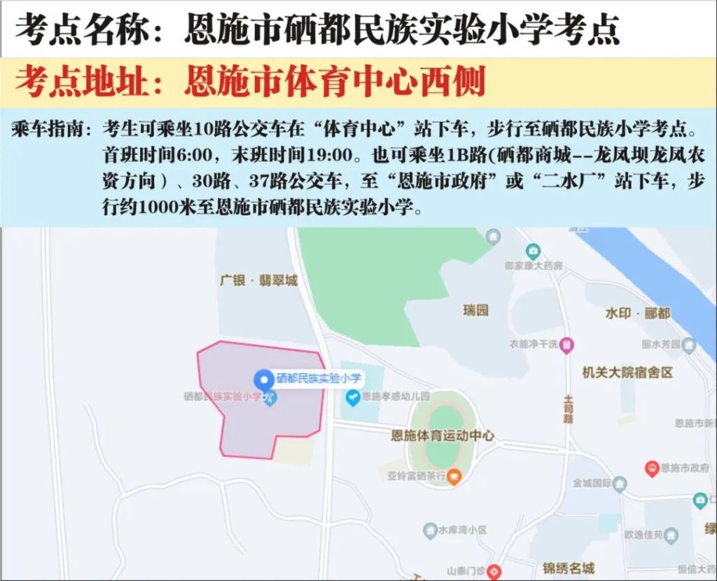 1.乘车指南:考生可乘坐10路公交车在“体育中心”站下车,步行至硒都民族小学考点。首班时间6:00,末班时间19:00。也可乘坐1B路(硒都商城--龙凤坝龙凤农资方向)、30路、37路公交车,至“恩施市政府”或“二水厂”站下车,步行约1000米至恩施市硒都民族实验小学。