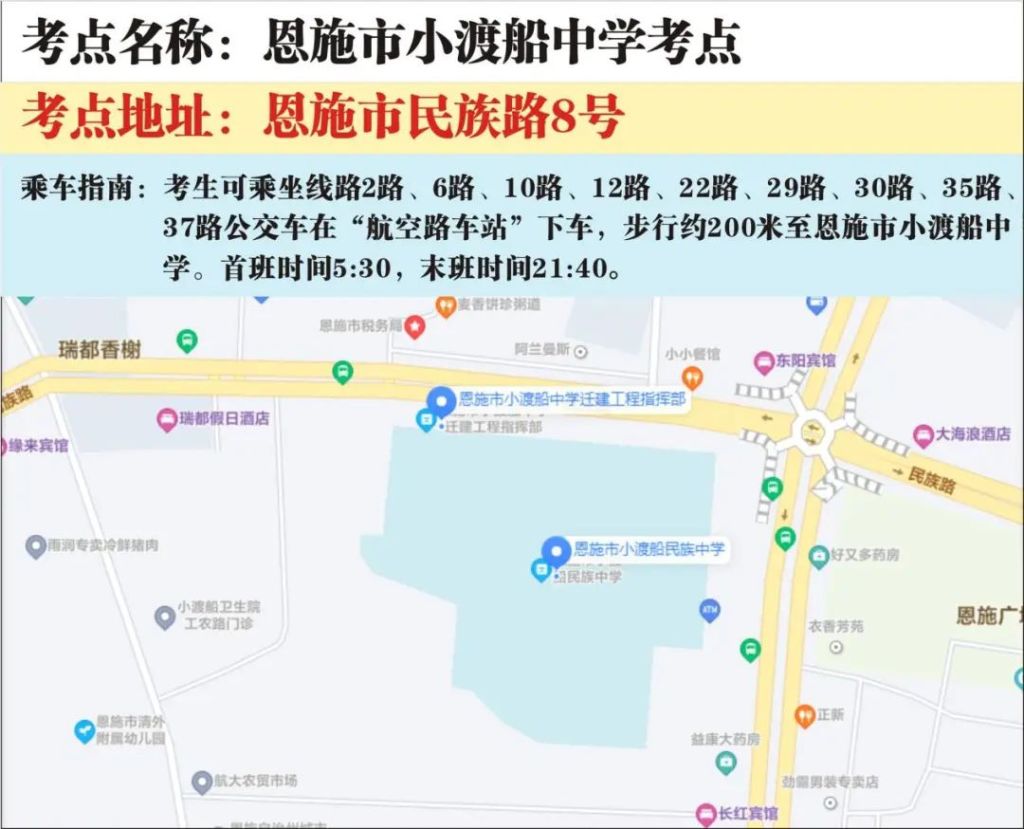 1.乘车指南:考生可乘坐10路、35路、37路在“小渡船中学”站下车,也可乘坐1A路(龙凤坝龙凤农资--喜福汇家居广场方向)、1B路、2A、2B路、6路(清江桥--火车站公交始发站方向)、12路(市中心医院--清江新城山水南站方向)、22路、29路、30路公交车在“航空路车站”站下车,步行约200米至恩施市小渡船中学,首班时间5:30,末班时间21:40。